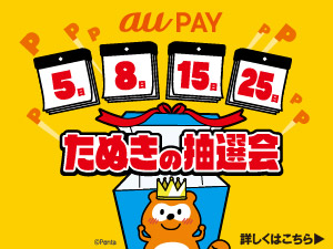 たぬきの抽選会たぬきの抽選会!200円(税込)以上をau PAY(コード/ネット支払い)で決済すると、Pontaポイントが必ず当たる! -