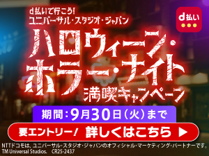 d払いで行こう!ユニバーサル・スタジオ・ジャパンハロウィーン・ホラー・ナイト満喫キャンペーンエントリー期間中に本キャンペーンにエントリーいただき、対象期間中に対象加盟店でd払い決済をすると、合計2,000円(税込)を1口として毎月抽選でユニバーサル・スタジオ・ジャパンの賞品などが当たる!