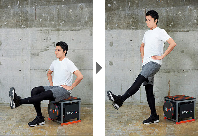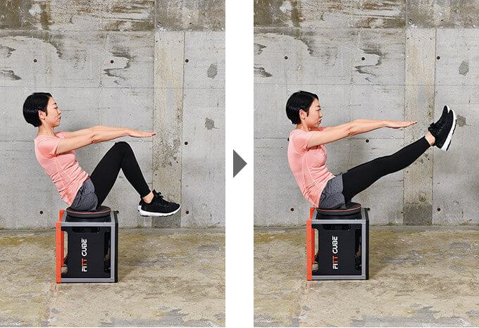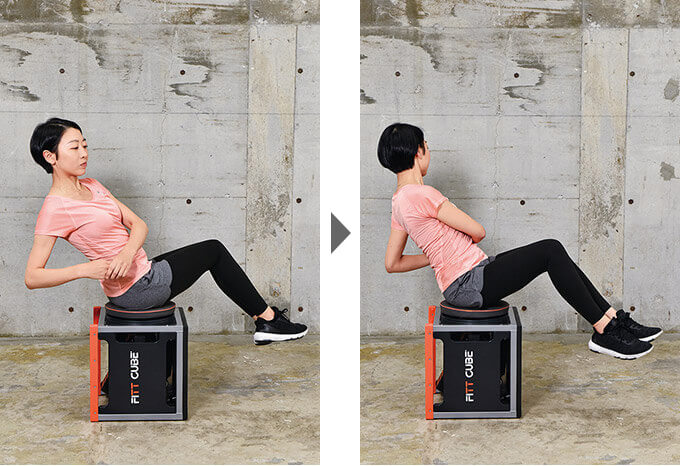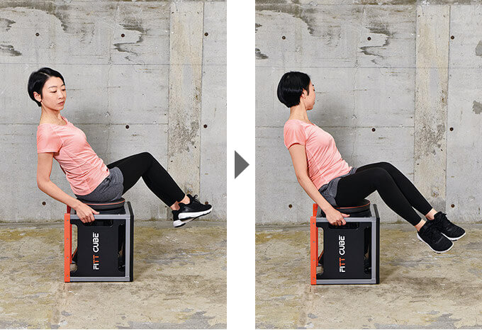 - ① ツイスト面に腰をかけ、フィットキューブに手をついて両足を軽く曲げて上げます。