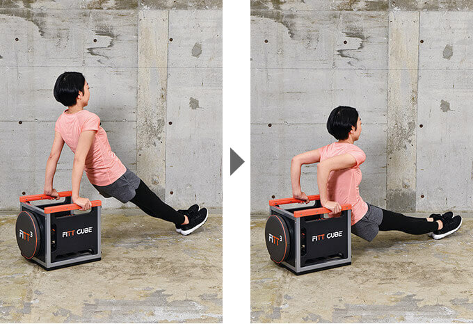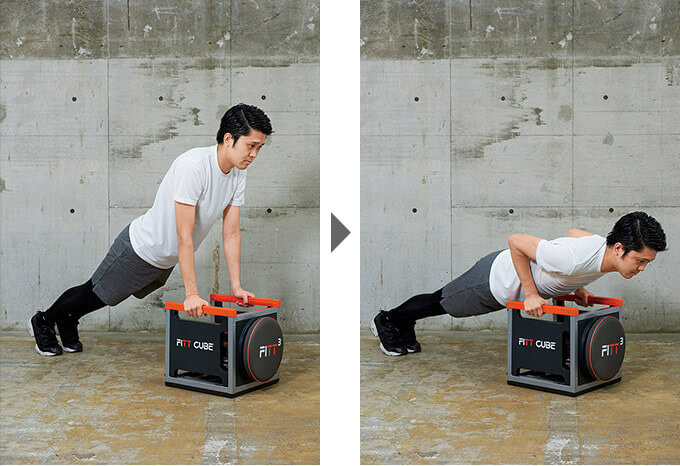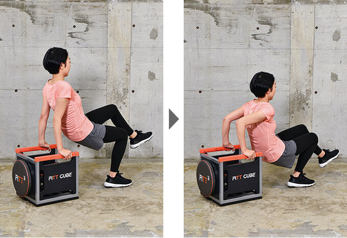 - ① フィットキューブに背を向け、左右のプッシュアップグリップを両手でしっかり握ります。両肘をピンと伸ばし、両膝を90度の角度にしてお尻を宙に浮かせます。