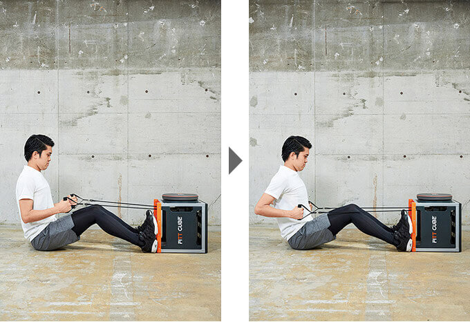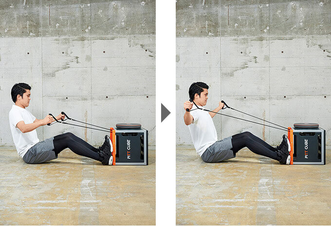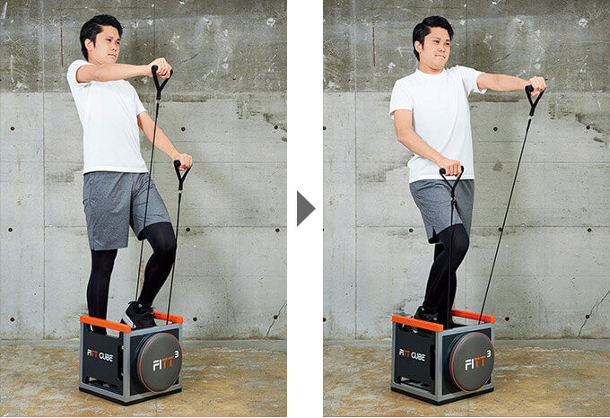 - ① 両足をフィットキューブにあてて、膝を軽く曲げて座ります。両手でレジスタンスバンドのグリップを握り、両肘を軽く曲げ両手で「前へならえ」をします。