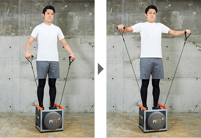 力を入れすぎて肩をすくめないようにしましょう。レジスタンスバンドがプッシュアップグリップに擦らないように両腕を上げ、限界の位置で2秒キープした後、両腕を下ろすとさらに効果が期待できます。