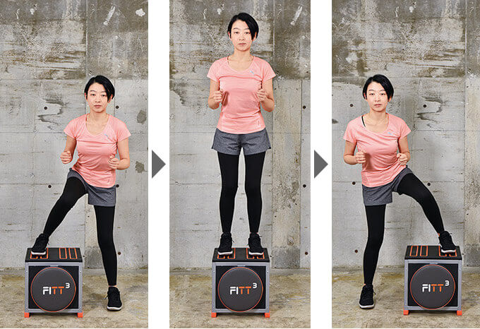 右足から乗ったら次は左足というように、左右バランスよく行いましょう。慣れてきたら、腕を大きく振り、顔を上げ遠くを見ながら背筋を伸ばして行いましょう。