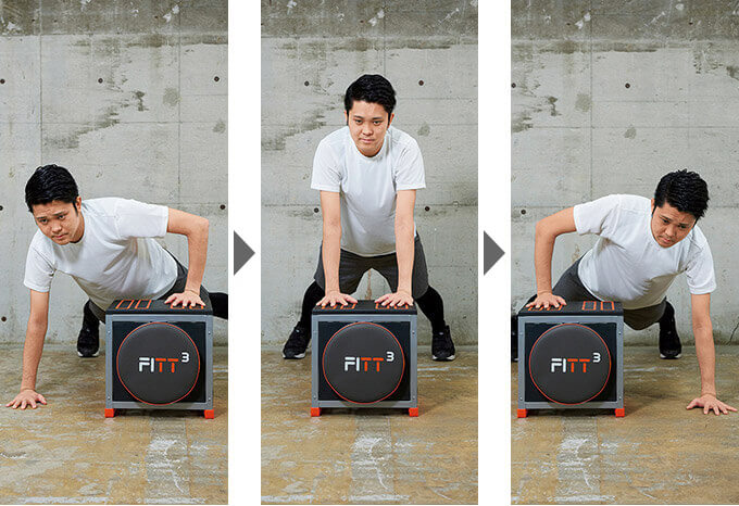 - ① 両足を肩幅に開きます。フィットキューブのスタンド面の上に両手を置き、腕立て伏せの姿勢をとります。