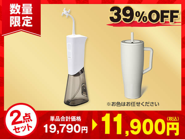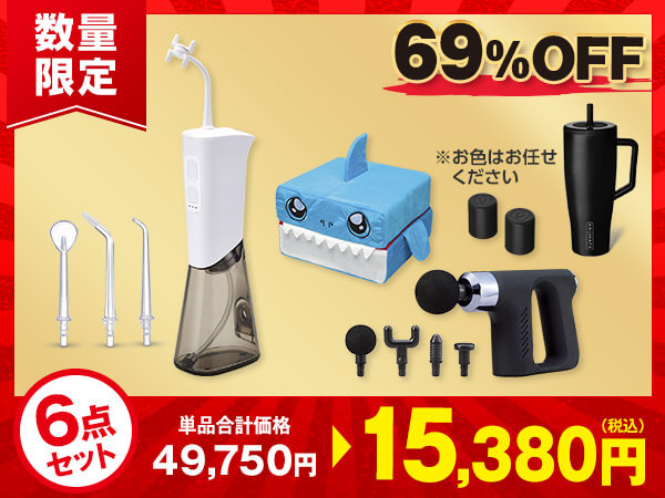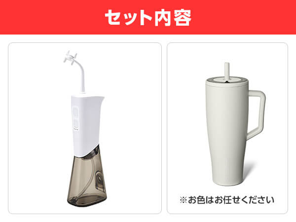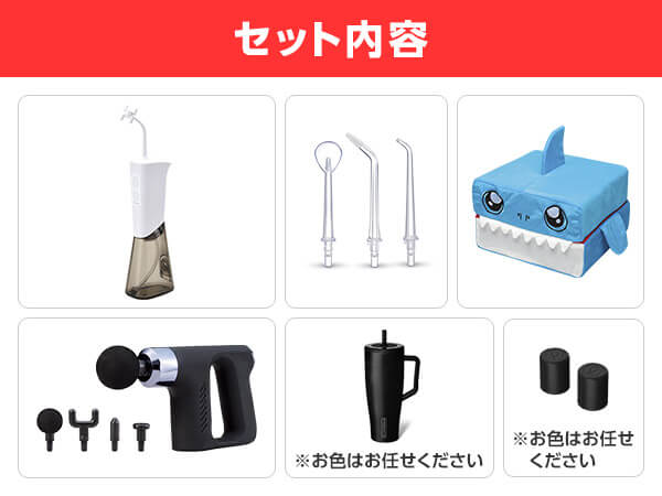 オーラルスマイル×1、ジェットウォッシャー×1、舌クリーナーノズル×1、矯正用ノズル×1、ブルーメイト エラ 40oz×1、ブルーメイト専用ストローキャップ×1、リフレッシュガン×1、ピローキューブキッズ×1