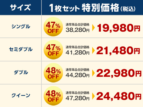 セミダブル : 約 厚さ50mm×幅1200mm×長さ1950mm