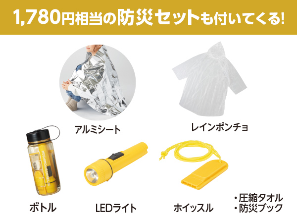 - セット内容/ボトル(630ml)×1 、レインポンチョ×1 、LEDライト×1 、アルミシート×1 、圧縮タオル×1 、ホイッスル×1 、防災ブック×1