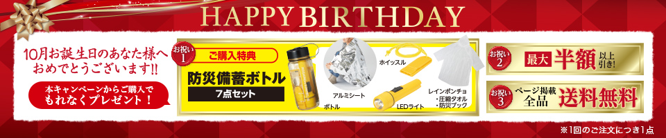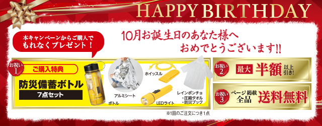 - セット内容/ボトル(630ml)×1 、レインポンチョ×1 、LEDライト×1 、アルミシート×1 、圧縮タオル×1 、ホイッスル×1 、防災ブック×1