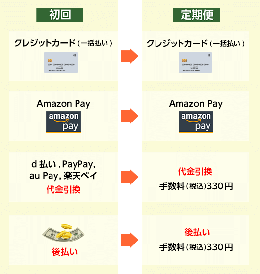 原則として本体をお申し込み頂いた際のお支払い方法と同じですが、お申込時のお支払方法がPayPay・au PAY・d払い・楽天ペイだった場合、定期便は自動的に代金引換(手数料330円(税込))でのお支払いとなりますのでご了承ください。