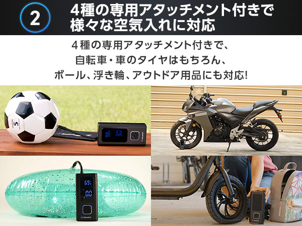 4種の専用アタッチメント付きで、自転車・車のタイヤはもちろん、ボール、浮き輪、アウトドア用品にも対応!