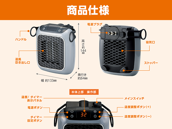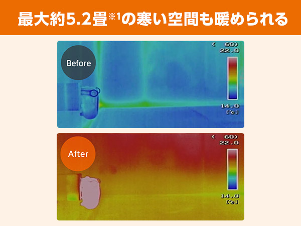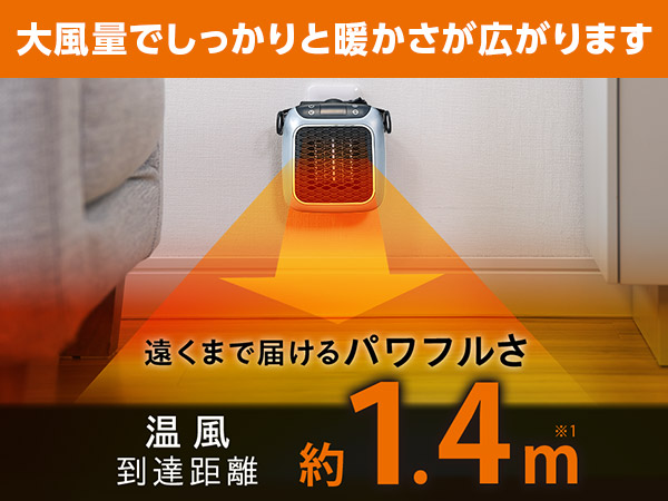 - 2 温風到着距離1.4m:室温約25℃で5分間動作させたとき、室温から10℃以上の温風が到達した距離。自社調べ。使用環境によって異なります