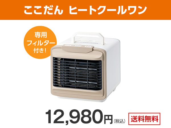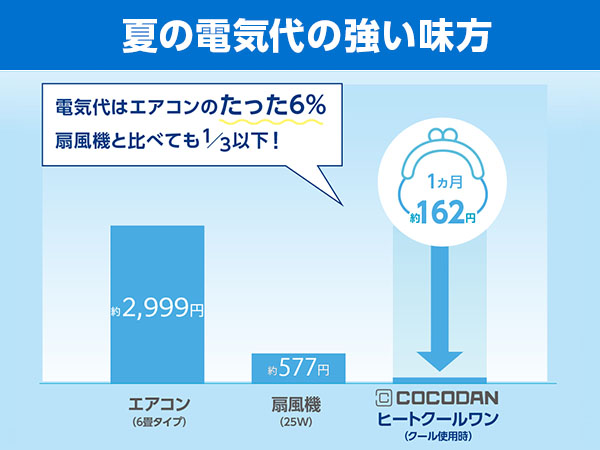 - 1 最低消費電力130Wの6畳タイプの一般的なエアコンと消費電力25Wの一般的な扇風機とここだん ヒートクールワンを風量(強)の消費電力7Wで動作させた場合の比較/1か月の電気代 エアコン(6畳タイプ)約2999円 扇風機約577円 ここだん ヒートクールワン約162円 1kWh=31円で計算 使用条件により異なります