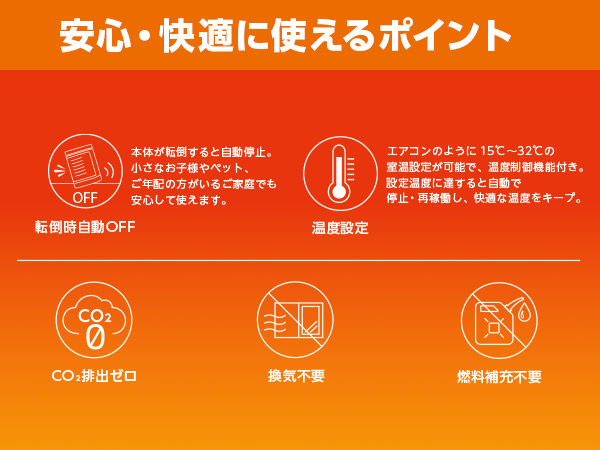 転倒防止機能や温度調整はもちろん、CO₂排出ゼロで安心。