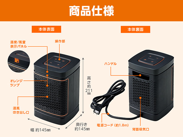 - 2 温風到着距離1.6m:室温約25℃で5分間動作させたとき、室温から10℃以上の温風が到達した距離。自社調べ。使用環境によって異なります