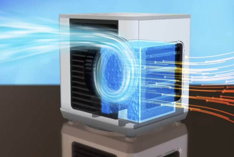 水が蒸発する際に、周りの熱を吸収して空気を冷やす“気化熱現象”を利用した技術で、パワフルに冷却!自然の涼しさを利用した優しい風を体感できます。
