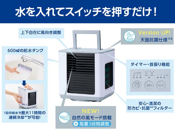 - 3 全ての菌を抑制するわけではありません。<抗菌> ●試験機関:(一財)ボーケン品質評価機構 ●試験方法:JIS Z2801 抗菌試験 ●抗菌方法:抗菌剤を練りこみ ●対象:トップ面、ボタン、ハンドル ●試験結果:99%以上抗菌 ●試験番号:40123004230/40123004818 ●発行日2023年9月25日/2023年10月27日 ※4 風量(弱)の場合の給水タンク1杯分の連続冷却運転可能時間(室温約30℃・湿度約60%)。条件により短くなります。※5 全ての菌やカビを抑制するわけではありません。<防カビ> ●試験機関:(一財)ボーケン品質評価機構 ●試験方法:JIS Z2911 カビ抵抗試験 ●防カビ方法:フィルターに防カビ剤を含浸 ●対象:防カビ抗菌フィルター ●試験結果:菌糸の発育が認められない ●試験番号:40118012088/9 発行日:2019年2月1日<抗菌> ●試験機関:(一財)ボーケン品質評価機構 ●試験方法:JIS L1902 菌液吸収法 ●抗菌方法:フィルターに抗菌剤を含浸 ●対象:防カビ抗菌フィルター ●試験結果:99%以上抗菌 ●試験番号:40118012086/7 ●発行日:2019年1月25日