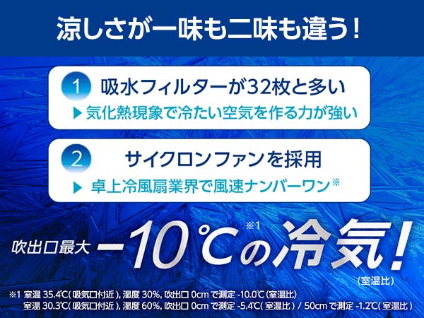 - 1 室温35.4℃(吸気口付近)、湿度30%、吹出口0cmで測定 -10.0℃(室温比)