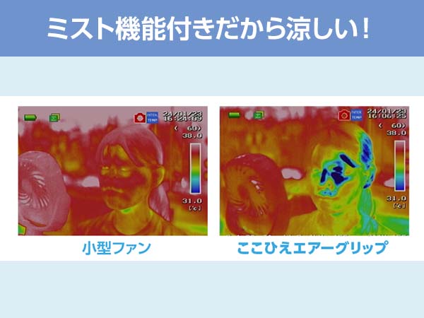 ミスト機能なしの小型ファンを使用した時と比較しても、ここひえ エアーグリップの涼しさは一目瞭然。ここひえ エアーグリップの方は、涼しさを表す青色にしっかり変化が表れました!