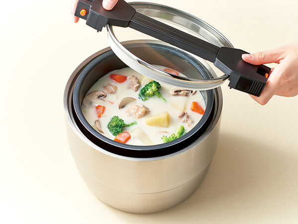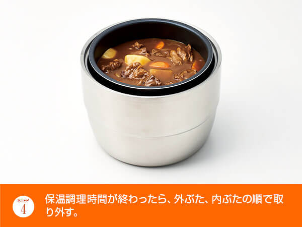 - 保温調理時間が終わったら、外ぶた、内ぶたの順で取り外す。