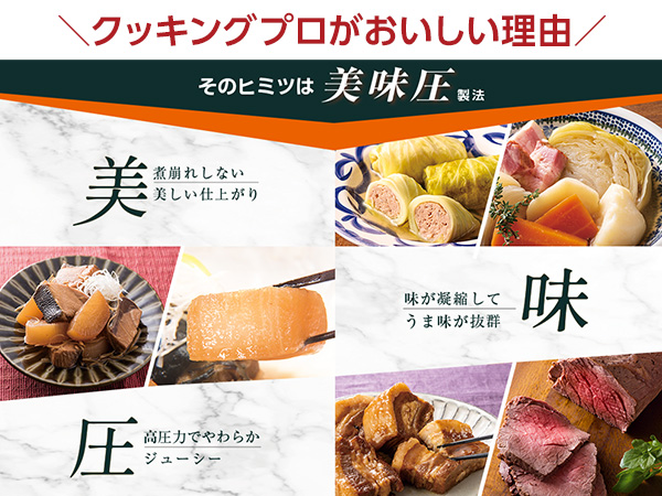 ②それぞれのメニューに適した圧力・温度・時間が設定されているから、本格的な料理が失敗せず、かんたんに、おいしく、見た目も美しく仕上がります。