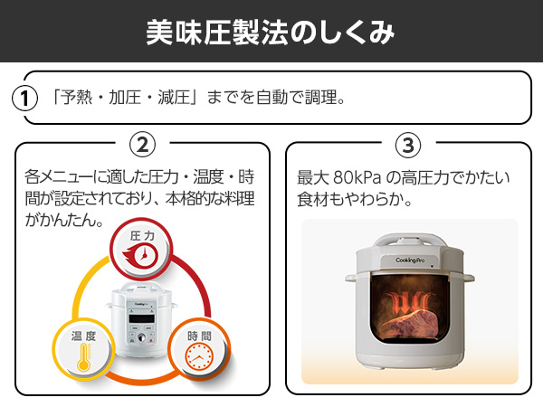 ③最大80kPaの高圧力!すばやく火を通すので、かたい食材も驚くほどやわらかに。