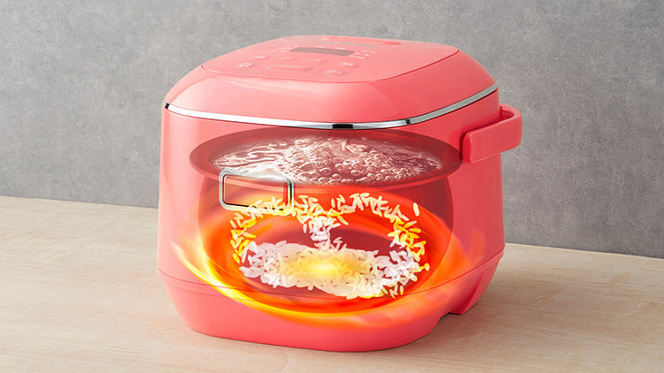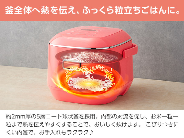 小型ながら、約2mm厚の5層コート球状釜を採用。この形状が内部の対流を促し、お米一粒一粒まで熱を伝えやすくします。だから、ふっくら粒立つ炊き上がりに。