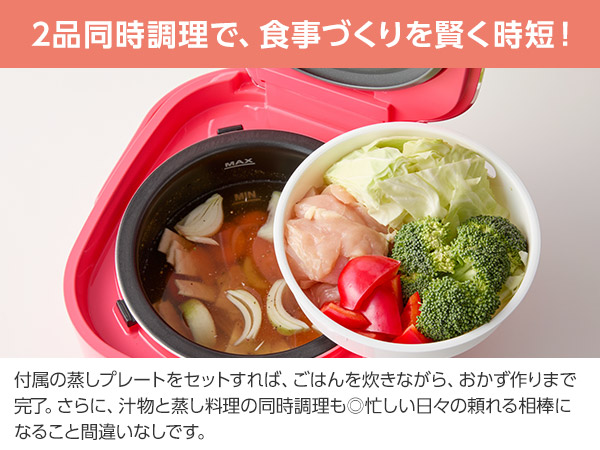 さらに、ごはんだけでなく、汁物と蒸し料理の同時調理も◎効率よく食事の支度ができるから、忙しい日々に頼れる相棒になること間違いなしです。