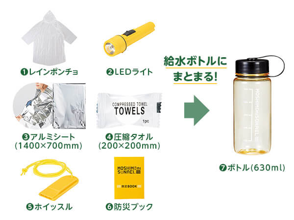 ボトル(630ml)×1 、レインポンチョ×1 、LEDライト×1 、アルミシート×1 、圧縮タオル×1 、ホイッスル×1 、防災ブック×1
