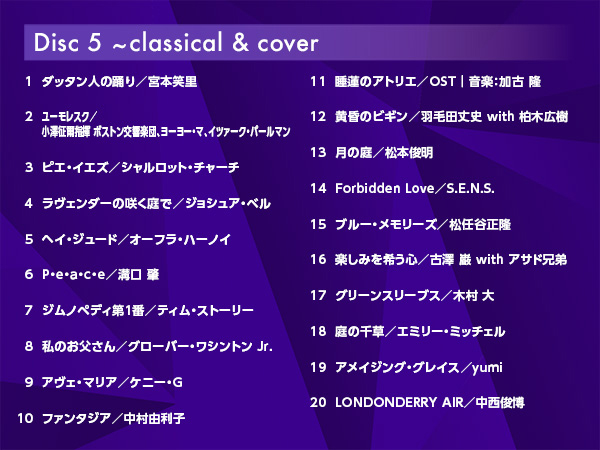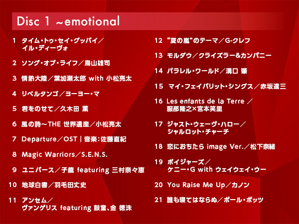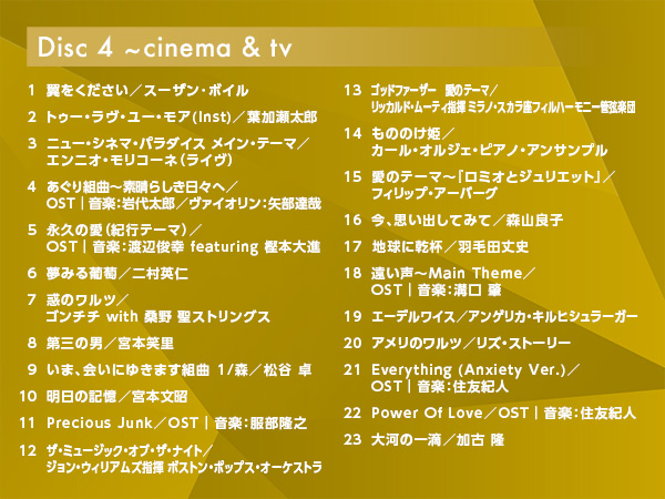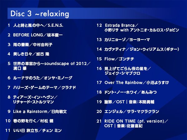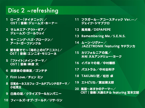日本を代表するメジャーレコード会社、ソニーミュージックがリフレッシュとリラクゼーションをテーマに、葉加瀬太郎、坂本龍一、森山良子、宮本笑里など、豪華アーティストたちがカバーした名曲と、映画『タイタニック』、『海の上のピアニスト』、『フラガール』、テレビ番組『情熱大陸』『世界遺産』など、時代を彩り、人の心に元気と癒しを与えてきた名曲やサウンドトラックを厳選収録しました。