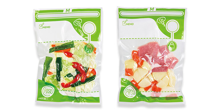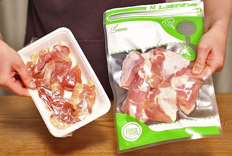 - 外部機関(日本ラボテック株式会社)での実験結果/一般ジッパーバッグとフォーサ真空バッグに食材を入れ家庭用冷凍庫で28日間保存した後、冷蔵庫内で12時間以上解凍した結果/保存期間28日間は消費期限を保証するものではありません/結果は保存状態・食材により異なります