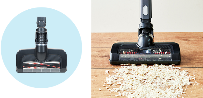 高速回転ブラシ付き電動パワーヘッドは、フローリングはもちろんカーペットの中に入り込んだゴミまでしっかりキャッチ。