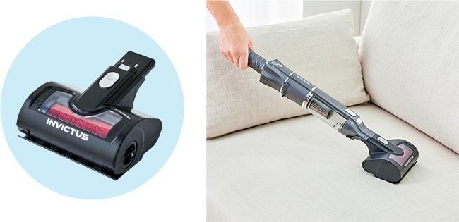 回転ブラシを搭載した、いろいろな生地表面のお掃除おすすめなミニヘッド。ソファーやシーツ、ファブリック生地のお掃除にも活躍です。