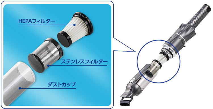 内蔵フィルターは、ステンレスフィルターと高性能HEPAフィルターの2層構造。