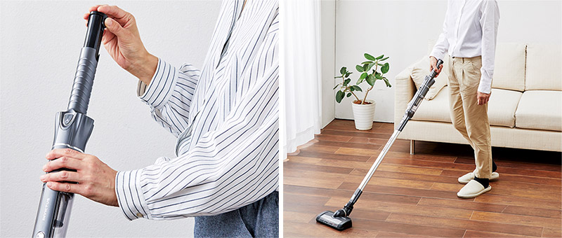 スティック掃除機にしても約1.3kg。片手でも軽々持ち上がり、階段の登り降りがあってもラクラクです。