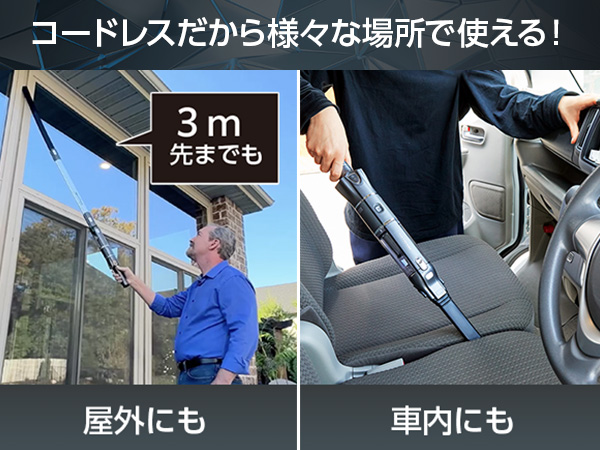 充電式で使えるコードレス設計だから、コードがひっかかる心配もありません。また、コンセントのない屋外や車のお掃除にも活躍します。