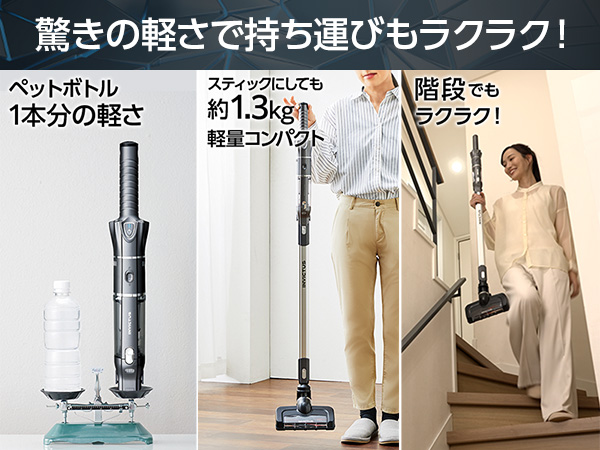 スティック掃除機にしても約1.3kg。片手でも軽々持ち上がり、階段の登り降りがあってもラクラクです。
