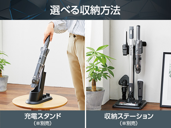 充電スタンドで卓上収納したり、自立式の専用収納ステーションでアタッチメントをまとめて収納したりお掃除スタイルに合わせて収納方法をお選び頂けます。専用収納ステーションはアタッチメントの収納だけではなく、本体の充電も可能です。