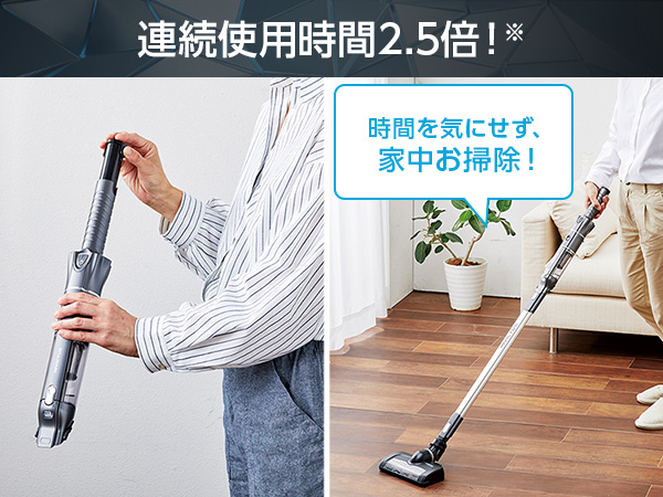 すみずみまで好きなだけお掃除してください。取り外し可能なバッテリーで、連続使用時間も2.5倍に!※