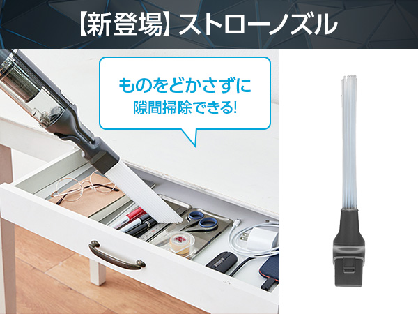 40本以上の筒状ノズルが小さなものだけを吸い込むので引き出しの中のほこりや、靴箱の砂など、ものをどかさずに掃除できるのが便利。