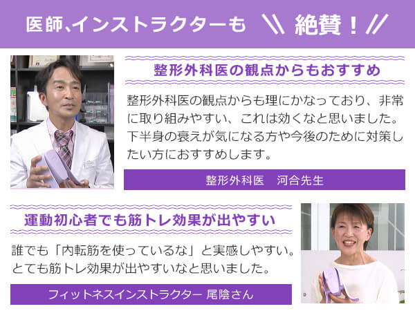 マイキュットでは普段しない動作である「挟み込み」を行うことに加え、振動が起こりそれを抑えることで内転筋がより効果的に働きます。整形外科医の観点からも理にかなっており、非常に取り組みやすい、これは効くなと思いました。内転筋を鍛えることは骨盤底筋の強化にもつながり、下半身の衰えが気になる方や今後のために対策したい方におすすめします。