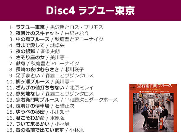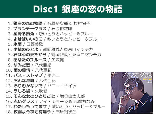 「夜霧よ今夜もありがとう」「つぐない」「ラブユー東京」など大ヒット曲を数多く収録しました。「有楽町で逢いましょう」「ブルー・ライト・ヨコハマ」などのご当地ソングから、「別れても好きな人」「居酒屋」「銀座の恋の物語」などのデュエット曲まで幅広いラインナップです!
