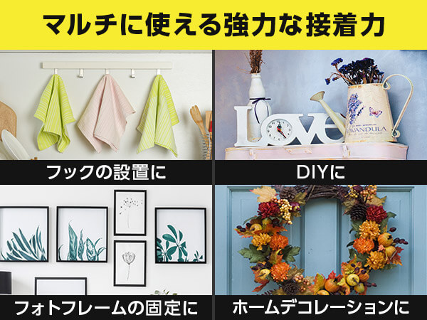 ガラス、金属、木材、タイル、カーペットなど多くの素材に対応し、屋内外問わず強力に固定。貼った瞬間からしっかり接着します。