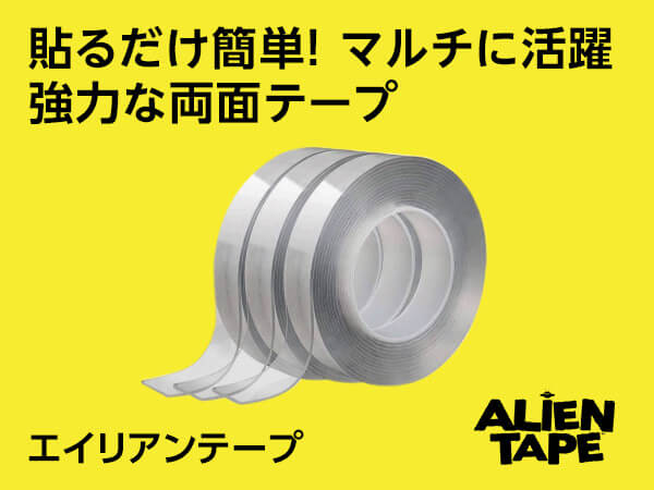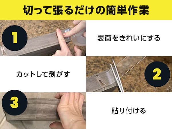 必要な長さにカットして裏紙を剥がし、貼るだけ。使い終わったらひねって外せるので、家具やラグの固定、屋外ライトや防犯カメラの設置にも便利です。