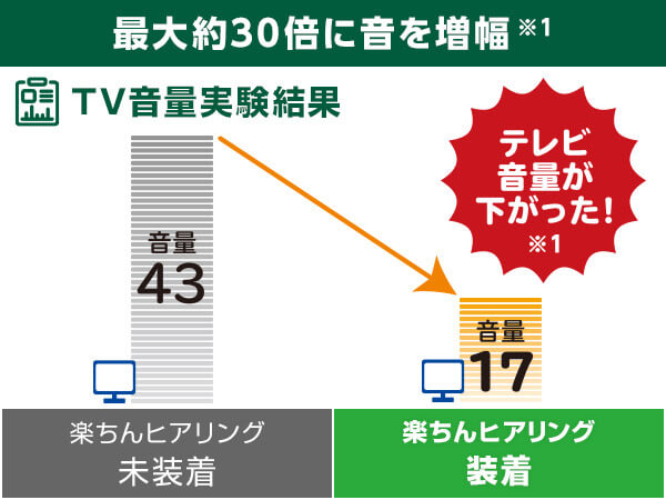 テレビ音量実験では、音量が43から17に減少した人も。テレビの音や会話が大きく聞こえて快適になります!