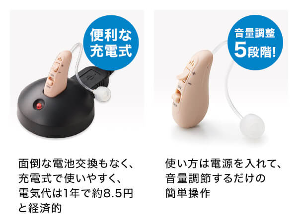本体音量調整スイッチ上部のマイクから音を取り込み、ICチップによってデジタル処理し、スピーカーから耳の中へ音を送り届けています。最大で約30倍に音を増幅して耳に届けるため、小さくて聞き取りにくかった声や音が大きくハッキリ聞こえます。