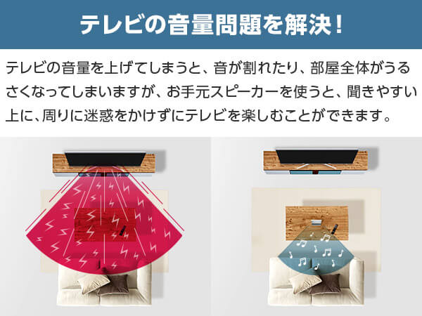 テレビの音量を上げてしまうと、音が割れたり、部屋全体がうるさくなってしまいますが、お手元スピーカーを使うと、聞きやすい上に、周りに迷惑をかけずにテレビを楽しむことができます。