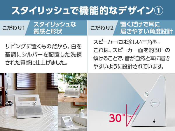 スピーカーには珍しい三角型。これは、スピーカー面を約30°の傾けることで、音が自然と耳に届きやすいように設計されています。