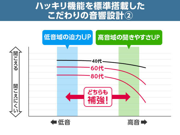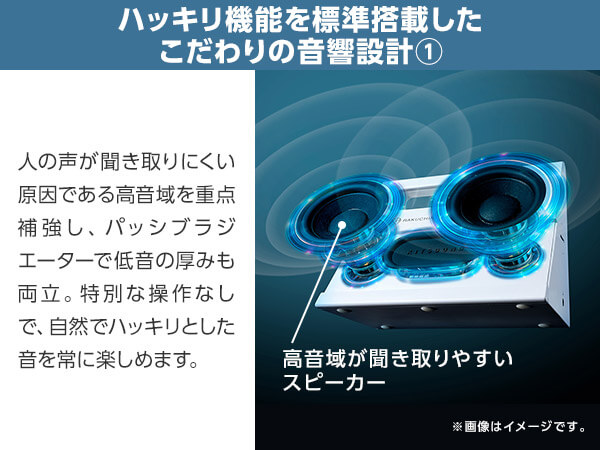 人の声が聞き取りにくい原因である高音域を重点補強し、パッシブラジエーターで低音の厚みも両立。