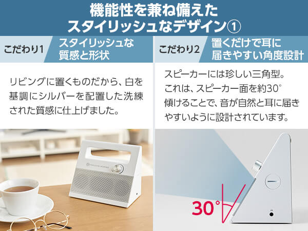 スピーカーには珍しい三角型。これは、スピーカー面を約30°傾けることで、音が自然と耳に届きやすいように設計されています。