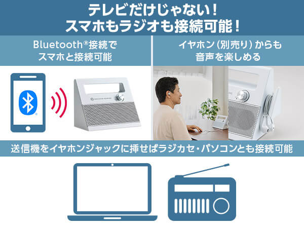 イヤホンジャックに送信機を挿せるものであれば、基本接続可能なので、ラジカセやパソコンの音をスピーカーで楽しむこともできます。